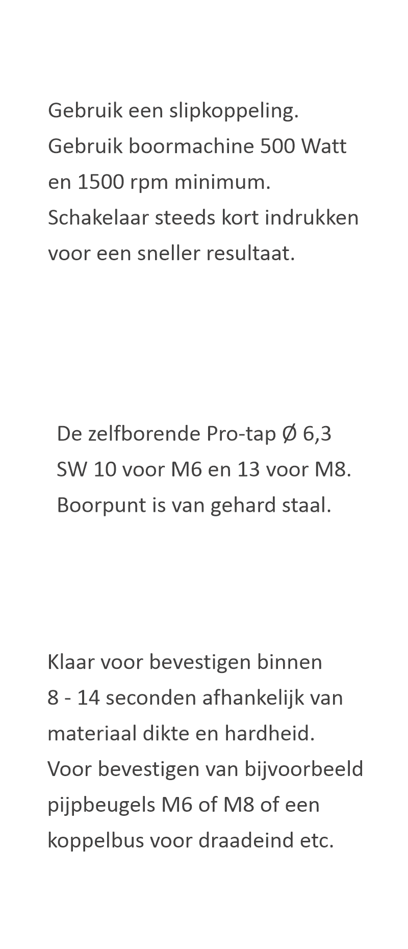 | Specificaties | : pro-tap zelfborend in metaal 1 t/m 6 mm met M6 of M8 aansluiting. |