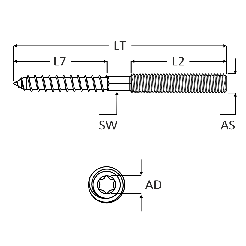 | benamingen | : stokeind, houtdraad plugbout, hanger bolts, stokschroef of tafelpootbout. |
